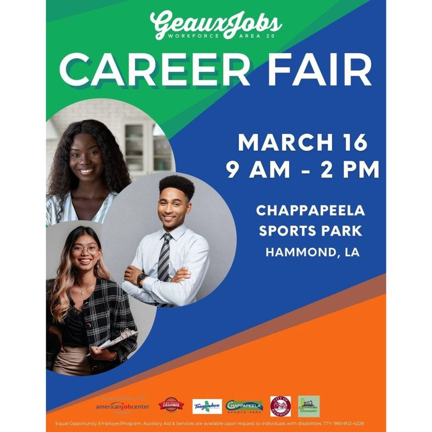 Don't forget to mark your calendars for the Geaux Job's Career Fair next Thursday, March 16, at Chappapeela Sports Park. Looking for work? Join us! We even have colleges attending, so teens are welcome, too! Register here: https://rpb.li/k3oxQ